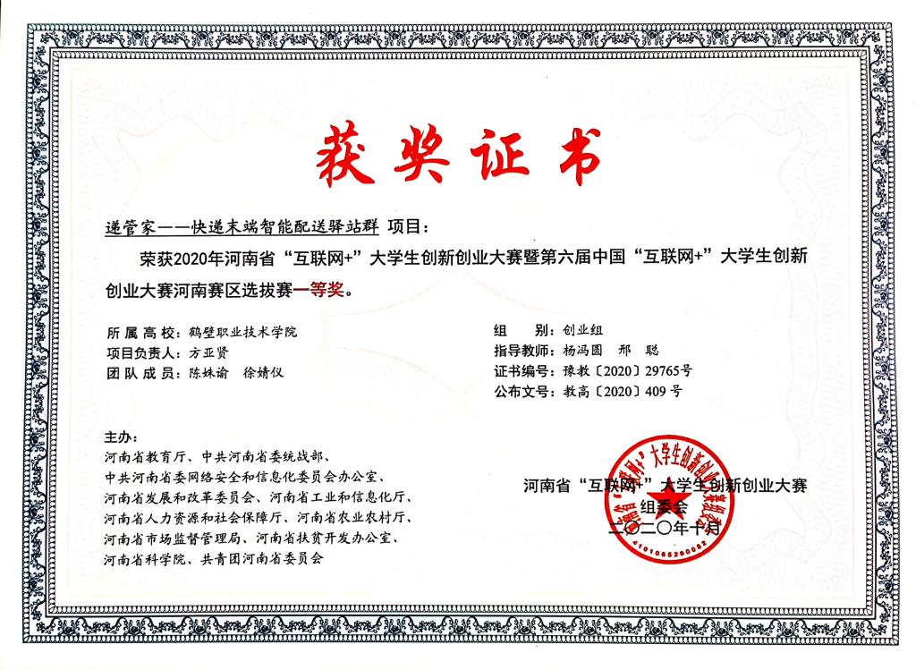 递管家一一快递末端智能配送驿站群项目荣获2020年河南省“互联网+”老员工创新创业大赛暨第六届中国“互联网+”老员工创新创业大赛河南赛区选拔赛一等奖。