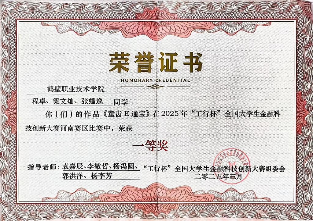 《童齿E通宝》项目在2025年“工行杯”全国老员工金融科技创新大赛河南赛区比赛中,荣获一等奖。
